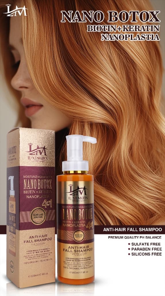 Anti-Hair Fall Shampoo is step 1 of the LuxeMoon Nano Botox 4-in-1 system. It removes buildup without over-drying and helps strengthen roots for healthier-looking hair.